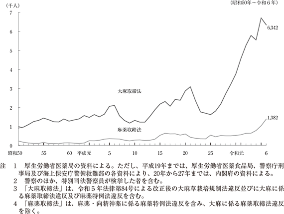 大麻取締法違反(大麻に係る麻薬取締法違反及び麻薬特例法違反を含む。)の検挙人員は、平成6年(2,103人)と21年(3,087人)をピークとする波が見られた後、26年から増加傾向にあり、令和6年は6,342人(前年比5.4%減)であった(図2(白書4-2-1-4図)参照)。このうち、20歳代の検挙人員は、平成26年から増加し続けていたが、令和6年は3,350人(同5.5%減)であった。20歳未満の検挙人員も、平成26年以降増加傾向にあったが、令和6年は1,128人(同7.7%減)であった。同年の大麻取締法違反による検挙人員の年齢層別構成比をみると、30歳未満が全体の約7割を占めている。