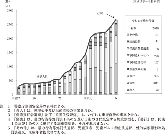 児童虐待に係る事件(刑法犯等として検挙された事件のうち、児童虐待防止法2条に規定する児童虐待が認められたもの)の検挙件数及び検挙人員は、平成26年以降大きく増加し、令和6年は2,649件(前年比11.1%増)、2,682人(同10.9%増)であり、それぞれ直近から20年前の平成17年(275件、295人)と比べると約9.6倍、約9.1倍であった(図3(白書4-6-1-1図)参照)。