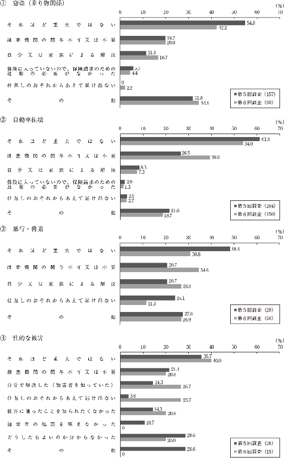 暗数調査における調査・分析結果によれば、犯罪被害に遭った被害者が被害を申告しなかった理由は、被害が潜在化する危険性が比較的高い被害態様でも、その犯罪類型や被害の特徴等により様々であることが明らかとなった。 財産的被害が中心となる犯罪類型(各種詐欺等被害等)においては、その経済的な損害が甘受できる程度の被害の大きさにとどまるケース等で、「それほど重大ではない」として被害を申告しなかった可能性が推察される。このような特徴等からすれば、この種の犯罪類型においては、被害の規模の大小や損害回復の有無にかかわらず、犯罪の被害を受けた場合には、まず警察等の捜査機関に相談して被害を届け出るよう啓発していくことが有益と考えられる。