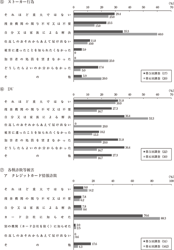 実際に発生した犯罪被害件数から認知件数を差し引いたものが犯 罪被害の暗数であり、この暗数の存在が犯罪被害の実態把握を困難 にしている。そのため、暗数調査では、暗数が発生する要因を探る ため、犯罪被害について調査対象者が捜査機関に被害申告をしな かった理由を調査しており、第5回調査及び第6回調査におけるそ の結果を被害態様別に見たものが、図3である。 第6回調査において過去5年間の被害申告率が3割以下にとど まった被害を中心に、第6回調査における被害不申告の理由を見る と、各種詐欺等被害のうち、クレジットカード情報詐欺では、「カー ド会社に知らせた」が約9割を占めて突出して高かったが、その他 の詐欺被害では、「それほど重大ではない」が4割強を占めていた。 「自動車損壊」では、「それほど重大ではない」が最も高く、5割強 を占めており、「ストーカー行為」及び「DV」では、「自分又は家 族による解決」が最も高く、5〜6割を占めていた。他方、「暴行・ 脅迫」及び「性的な被害」では、特定の被害不申告の理由が過半数 を占めることはなく、複数の理由に分散する傾向が見られた。この うち、「性的な被害」では、「それほど重大ではない」が4割であっ たが、そのほかに3割に達した理由はなく、「自分で解決した(加 害者を知っていた)」及び「仕返しのおそれからあえて届け出ない」 が3割弱、「捜査機関の関与不可又は不要」、「被害に遭ったことを 知られたくなかった」及び「どうしたらよいのか分からなかった」 が2割であった。なお、「加害者の処罰を望まなかった」は該当が なかった。
