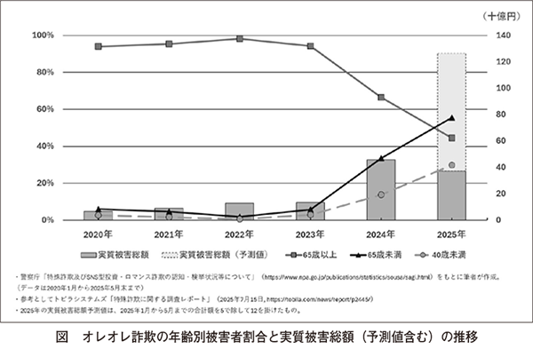 令和7年5月末に公開された警察庁の統計報告1によれば、直近の約5年間で特殊詐欺の被害総額は433億円増(+252%)と急騰しており、令和7年においても、過去最高であった昨年を上回る勢いで被害総額・認知件数ともに伸長している。とりわけその傾向が顕著なのは、昨年の特殊詐欺被害総額の約64%を占めるいわゆる「オレオレ詐欺」である。その背景には、高齢者の被害が観念されがちなオレオレ詐欺の被害が、図に示す通り現役世代で拡大している事実がある。「国民を詐欺から守るための総合対策2.0」2といった政府主導の対策をはじめとする官民を挙げた取り組みが活発に行われる中でのこうした深刻な情勢は、SNS の普及やAI の台頭を契機とした手口の複雑化、巧妙化に加え、高齢被害者を主として想定した従来型の対策の限界を示している。本稿では、こうした現役世代におけるオレオレ詐欺被害拡大の原因を分析したうえで、全世代を対象とした新たな対策の方向性を提案し、オレオレ詐欺のみならず特殊詐欺全体の被害縮小を図る。U 現状の分析