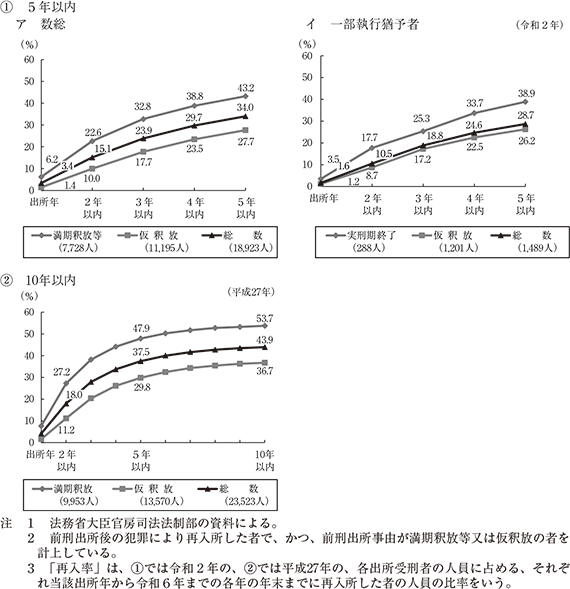 出所受刑者の再入所状況については、令和2年の出所受刑者の5年以内再入率(ある年の出所受刑者人員のうち、出所後の犯罪により、出所年を1年目として5年目(令和2年の出所受刑者であれば令和6年)の年末までに再入所した者の人員の比率)の総数を見ると34.0%であり、平成27年の出所受刑者の10年以内再入率の総数を見ると43.9%であった(図5(白書5-3-6図)参照)。