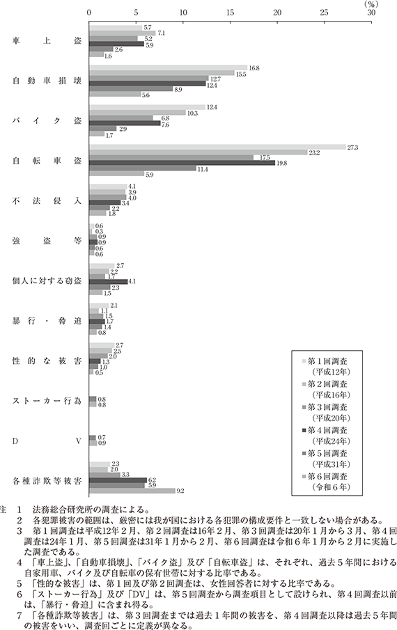 過去5年間における被害態様別の被害率(各被害態様の有効回答者のうち、犯罪被害に遭った者の比率)を第1回調査から第6回調査までの調査回別に見たものが、図1である。なお、本図を見るに当たっては、「ストーカー行為」及び「DV」は、第5回調査から調査項目として設けられたものであり、第4回調査以前は、「暴行・脅迫」に含まれ得ること及び「各種詐欺等被害」では、第3回調査までは過去1年間の被害を、第4回調査以降は過去5年間の被害をいい、調査回ごとに定義が異なることに留意が必要である。