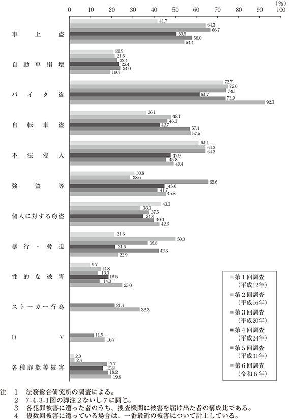 多くの被害態様では、第6回調査における過去5年間の被害申告率が、第5回調査から上昇しており、このうち、性的な被害及びストーカー行為では10pt 以上、バイク盗では15pt 以上、それぞれ上昇している。もっとも、前回調査よりも被害申告率は上昇しているものの、各被害に遭った者のうち捜査機関に被害を届け出た者は、ストーカー行為では約3人に1人、性的な被害では約4人に1人、各種詐欺等被害では約5人に1人の割合にとどまっており、他の被害態様と比べると、被害が潜在化する危険性が高いといえる。他方、車上盗、自動車損壊及び暴行・脅迫では、第6回調査における過去5年間の被害申告率は、第5回調査から低下しており、特に暴行・脅迫ではほぼ半減している。