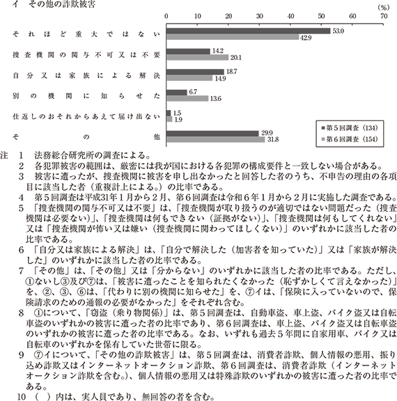 暗数調査における調査・分析結果によれば、犯罪被害に遭った被害者が被害を申告しなかった理由は、被害が潜在化する危険性が比較的高い被害態様でも、その犯罪類型や被害の特徴等により様々であることが明らかとなった。 財産的被害が中心となる犯罪類型(各種詐欺等被害等)においては、その経済的な損害が甘受できる程度の被害の大きさにとどまるケース等で、「それほど重大ではない」として被害を申告しなかった可能性が推察される。このような特徴等からすれば、この種の犯罪類型においては、被害の規模の大小や損害回復の有無にかかわらず、犯罪の被害を受けた場合には、まず警察等の捜査機関に相談して被害を届け出るよう啓発していくことが有益と考えられる。