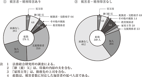 また、性犯罪被害者のうち、精神障害を有する者については、自らが遭遇した犯罪等の被害を適切に申告できず、被害が潜在化しやすいという問題点が指摘されている。しかし、暗数調査では、その性質上、精神障害を有する者の性犯罪被害の実態を具体的に解明することが困難である。法務総合研究所は、暗数調査のほかに、昭和61年版犯罪白書特集「犯罪被害の原因と対策」、平成11年版犯罪白書特集「犯罪被害者と刑事司法」等において、犯罪被害や犯罪被害者等の実態等について調査・研究を実施してきたが、これらの調査・研究から相当の年月が経過している。そして、法務総合研究所では、これまで精神障害を有する者の性犯罪被害の実態に焦点を当てた研究はない。そこで、第4次犯罪被害者等基本計画に沿って、令和5年、性犯罪被害者のうち、精神障害を有する者に焦点を当てて、刑事事件の確定記録調査(以下「精神障害を有する者等の性犯罪被害調査」という。)を実施した。