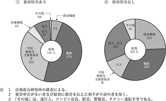 精神障害あり群について、最初に被害を伝えた相手は、ほとんどが捜査機関ではなく、親族や、学校・勤務先・支援関係者等の被害者の身近な者であることが多かった。前記(5)のとおり、犯行発覚まで長期間を要する傾向が見られたことなどを踏まえると、被害者から最初に被害を伝えられたこれらの相手方が、事実確認等のために内部的な聞き取りを実施するなどしている間に、捜査機関への犯行発覚が遅れる可能性が推察された。また、被害者による被害申告の有無を見ると、そもそも被害申告がない場合も多く、3割を超えていた。
